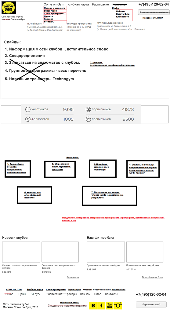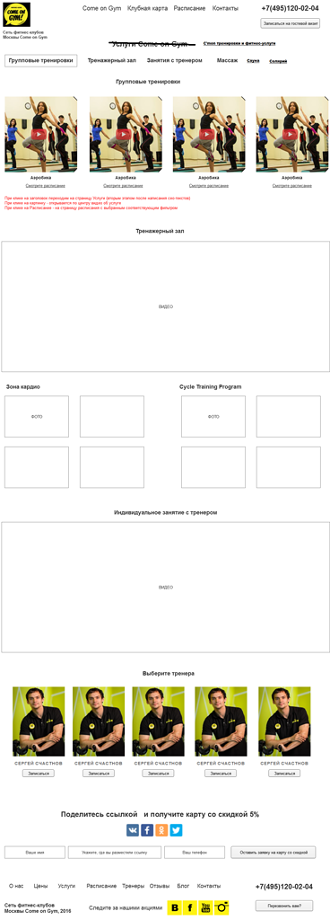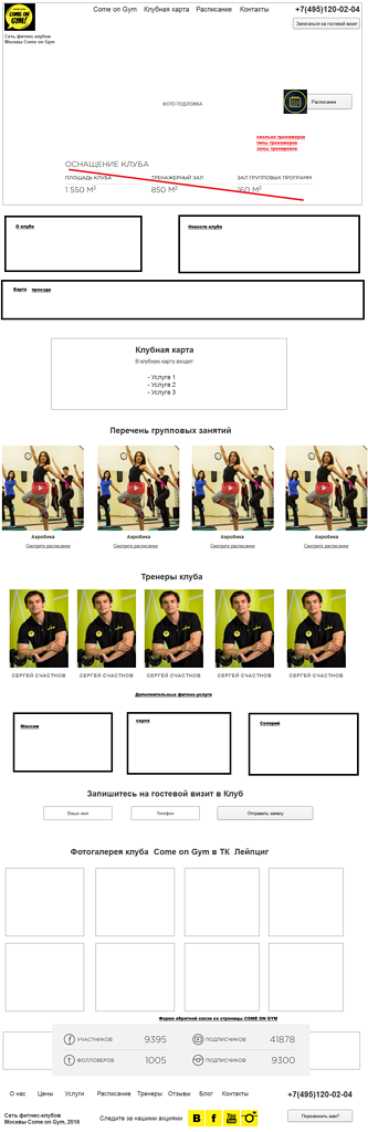 Прежде чем приступить к работам по созданию сайта, мы провели анализ уже существующего сайта клиента и выявили его недочеты, которые необходимо было учитывать при разработке новых страниц. Были созданы прототипы для каждой страницы сайта: для разделов «Услуги», «Отзывы», «Вакансии», «Блог», «Контакты», а также страниц каждого из клубов.