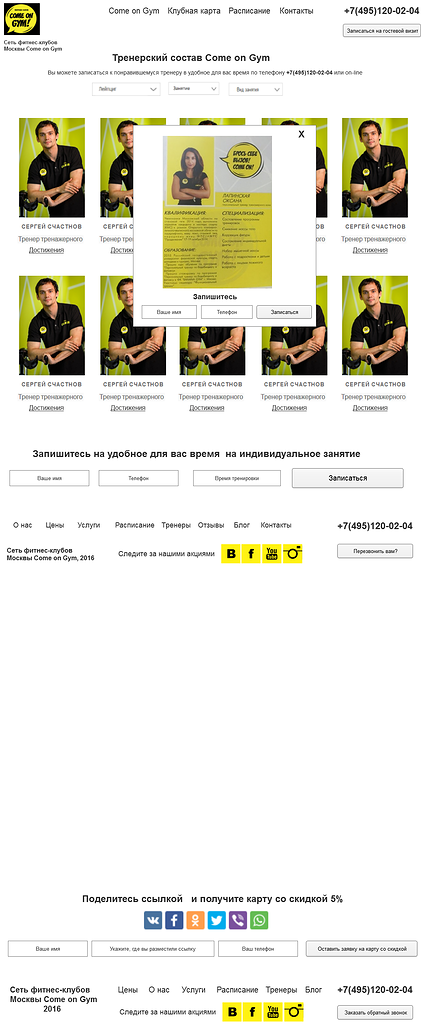 Специально для Come On Gym была разработана уникальная дизайн-концепция, — разделение экрана сайта на 3 области. Такая концепция позволила показать актуальную информацию и постоянным клиентам, и новым посетителям: новых она знакомит с жизнью клуба (на центральном и левом экранах), а текущих вовлекает в нее (на экране справа). Каждая область имеет свой скролл.