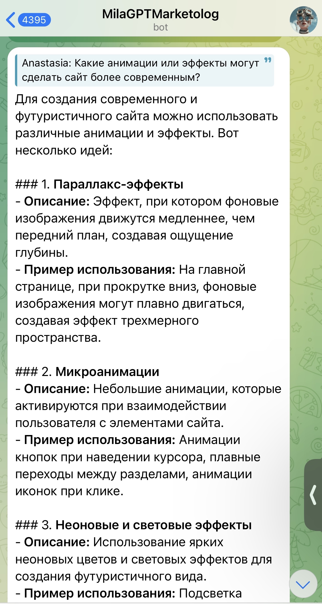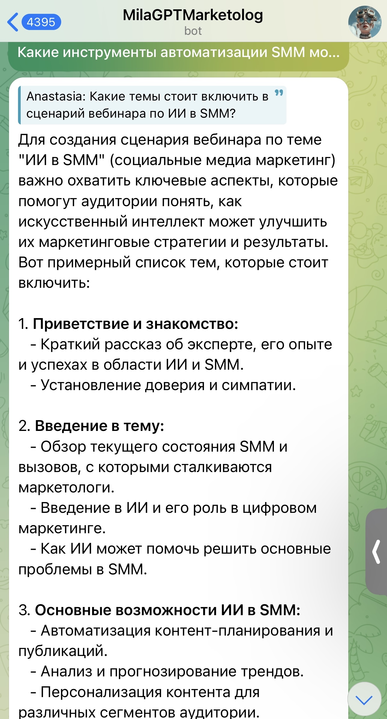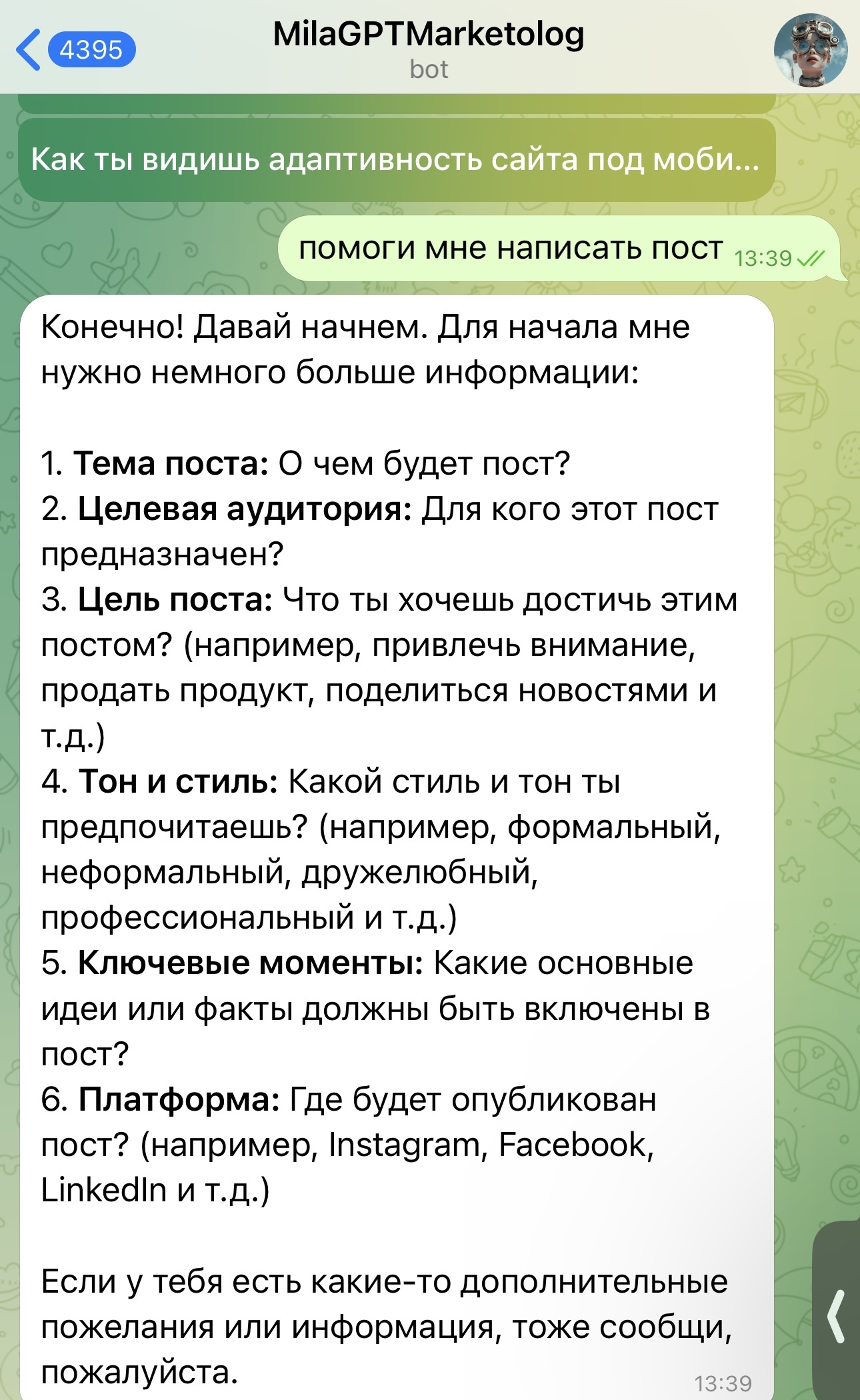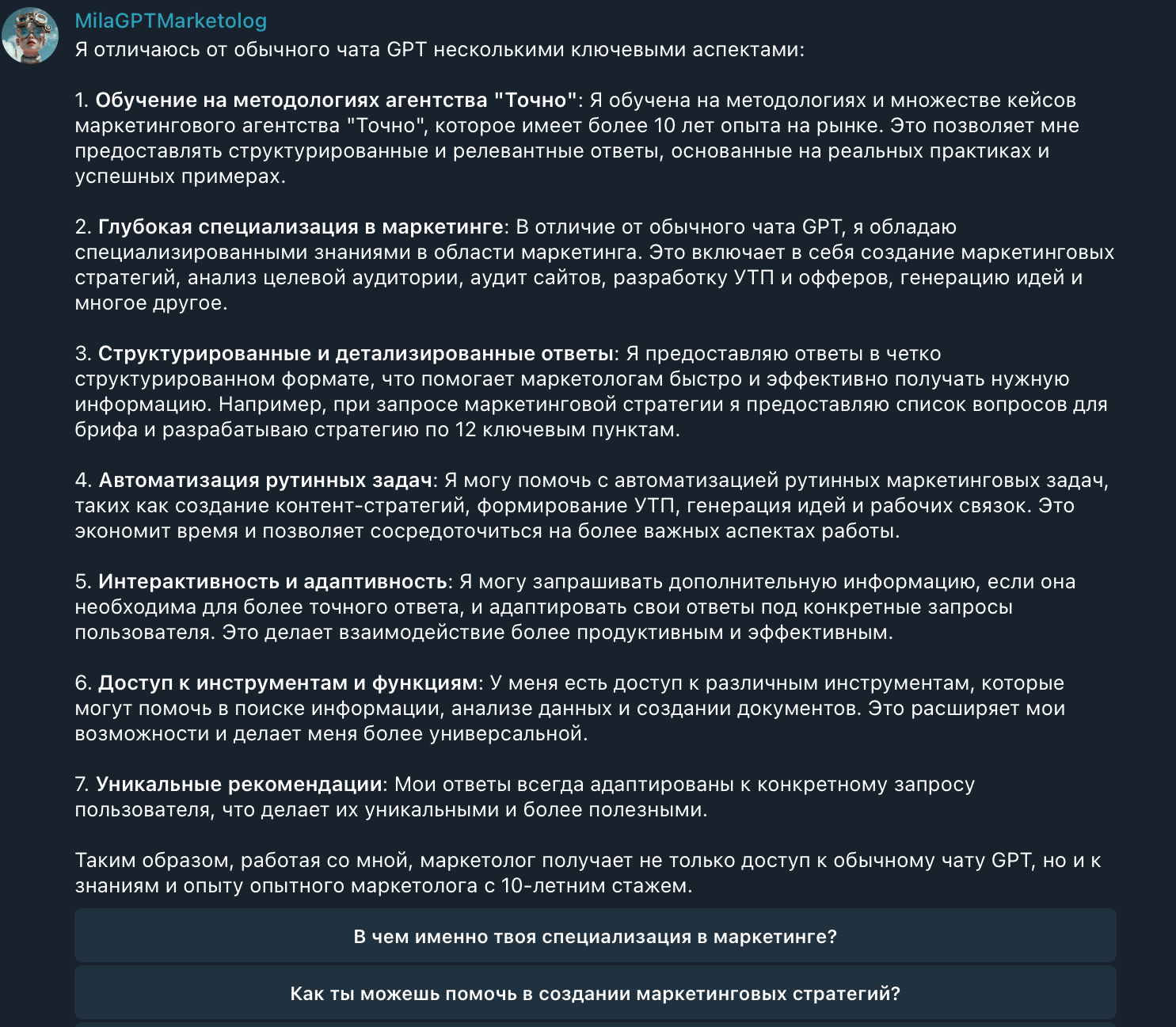 Всегда под рукой в вашем телефоне. Специализирован на решении узких маркетинговых задач, таких как анализ целевой аудитории, создание контент-планов, разработка УТП и офферов, поиск информации в интернете и социальных сетях, создание изображений и файлов
